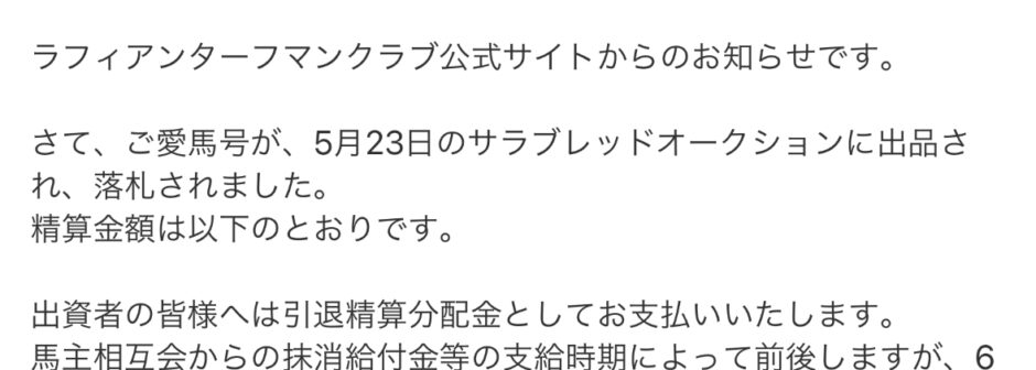 そういえば、以前出資していたマイネルレハイムは、引退でオークションに出たけど、取り消して現役続行という超レアケース・・・というのは経験しています。