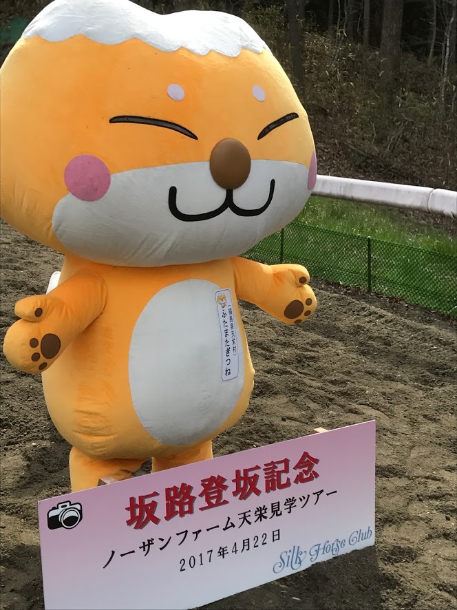坂路を登った後は恒例の天栄村ゆるキャラ「ふたまたぎつね」との記念撮影。